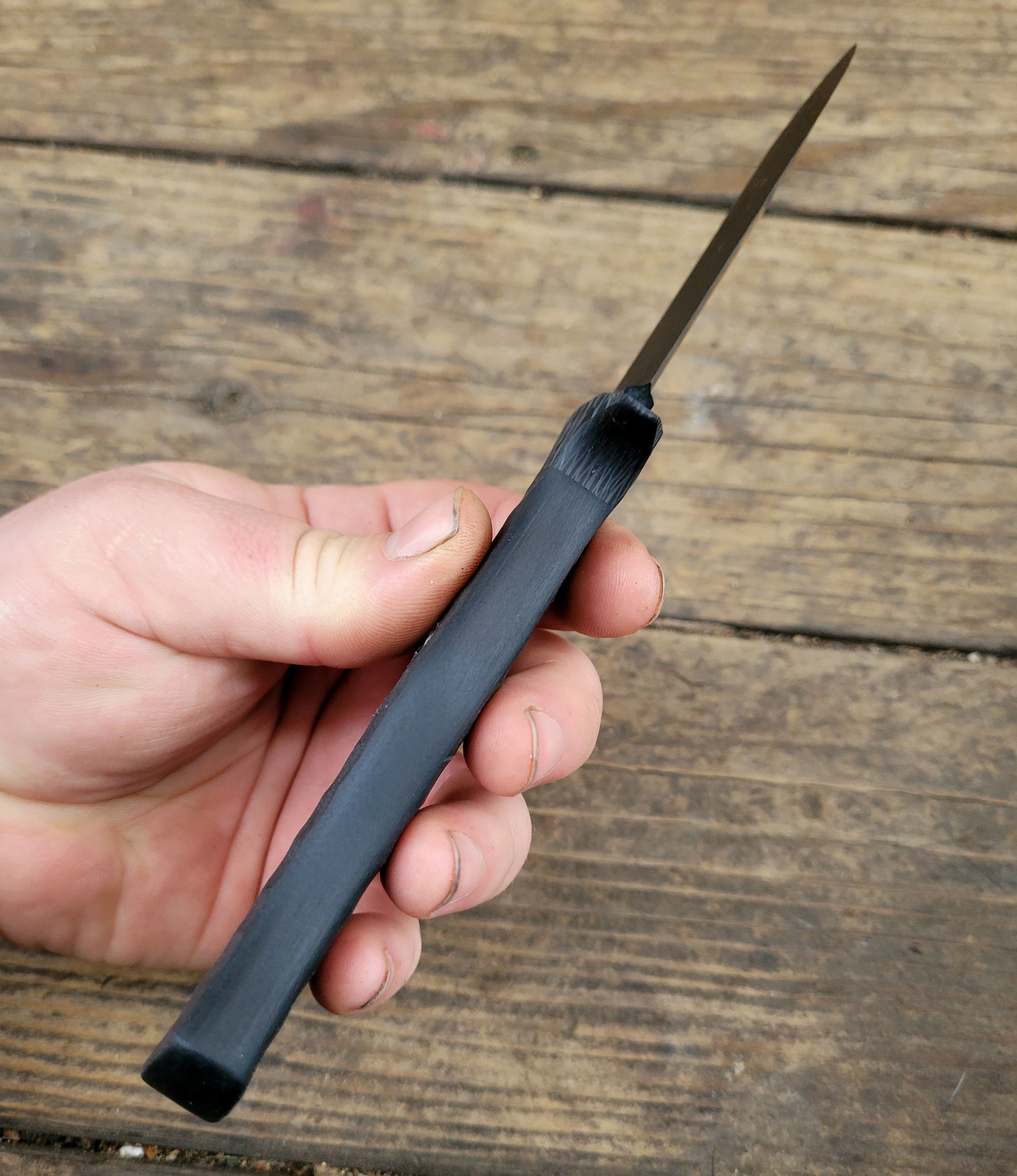 This tactal hidden tang knife is handmade in roughly 3/16" thick CPM Magnacut heat treated to 61-62 HRC. Carbon fiber guard, Armor Black Cerakote blade finish. The G10 handle is secured with torx bolts and Gflex epoxy. Includes black Kydex Sheath.