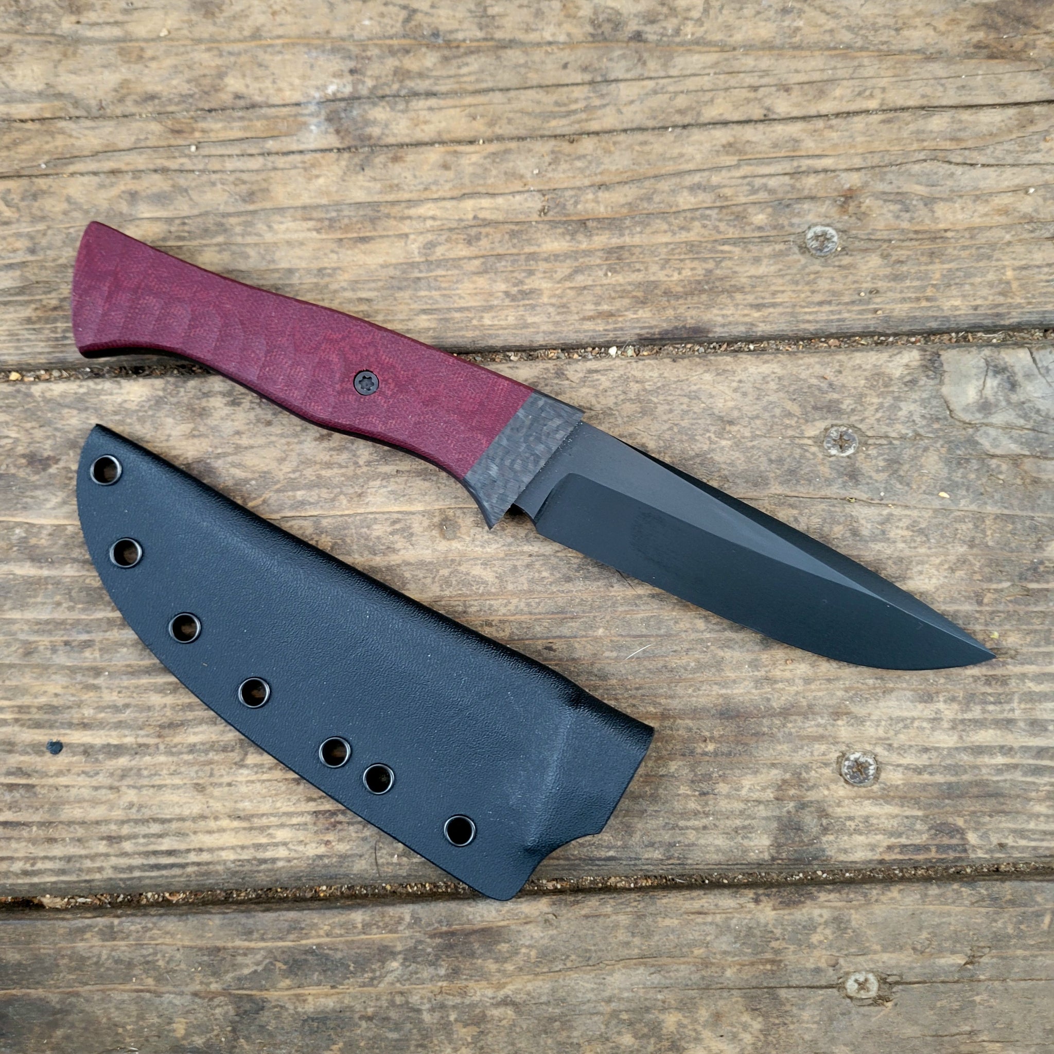 This tactal hidden tang knife is handmade in roughly 1/4" thick CPM3V heat treated to 61-62 HRC. Carbon fiber guard, Armor Black Cerakote blade finish. The micarta handle scales are secured with torx bolts and Gflex epoxy. Includes black Kydex Sheath.