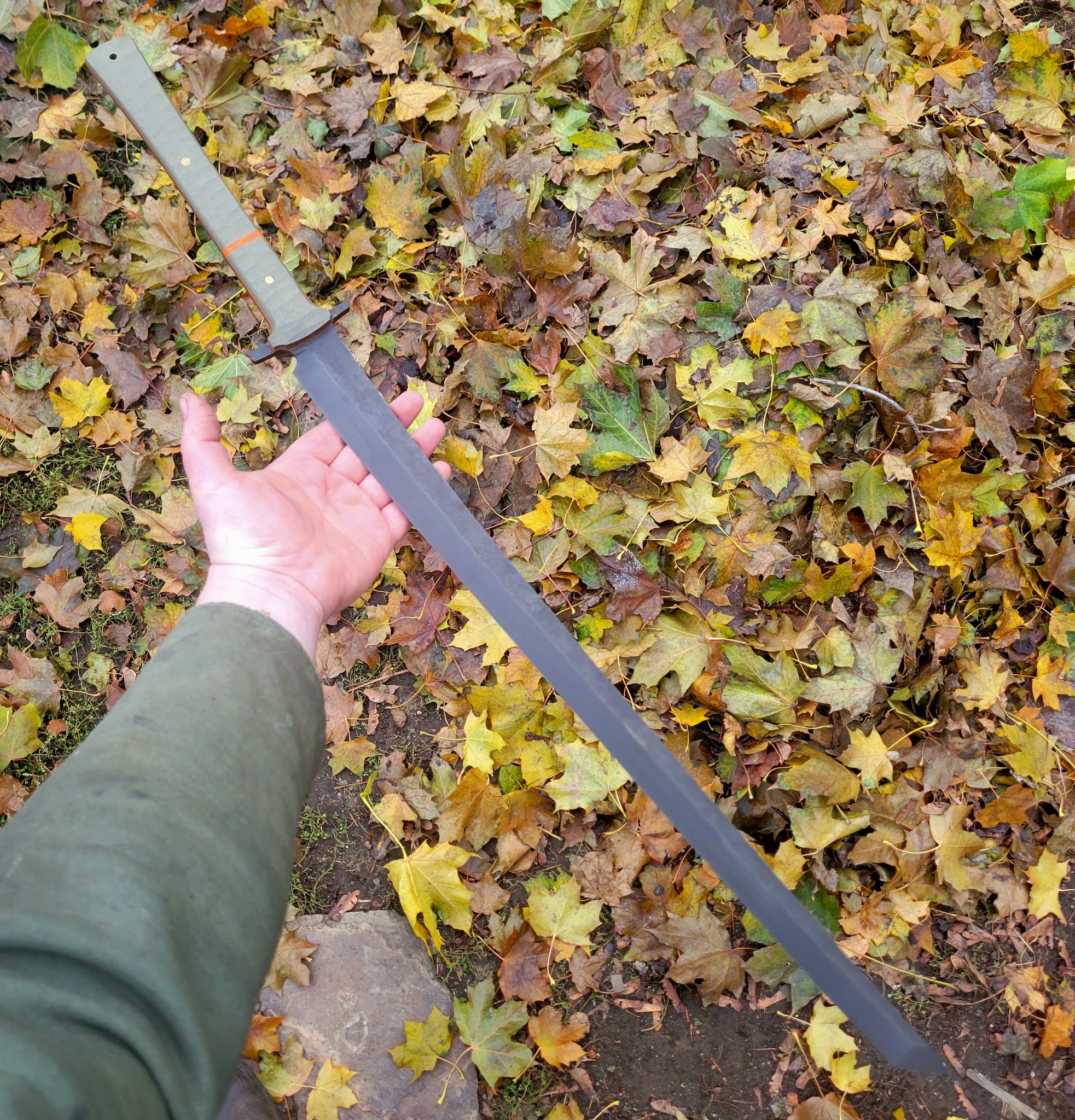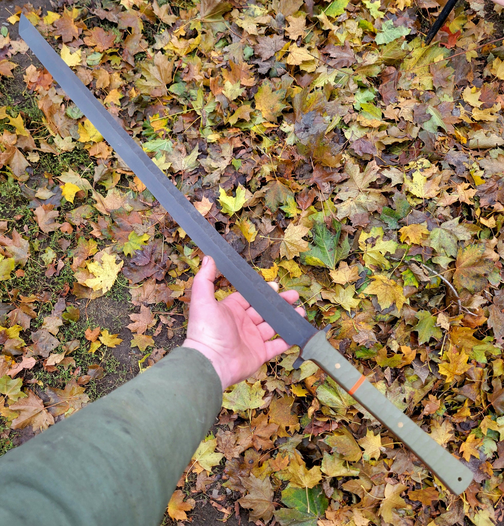 This full tang Wakizashi Chopper is 24" cutting edge, 36" overall. Made in roughly .250" thick 80CRV2 with forge textured flats. Handle scales are OD Green G10 with Orange G10 liners and spacers. The blade is 2" wide at the base and tapers to 1.7" wide near the tip. Heat treated to 59-60 HRC. Comes with a black kydex sheath.