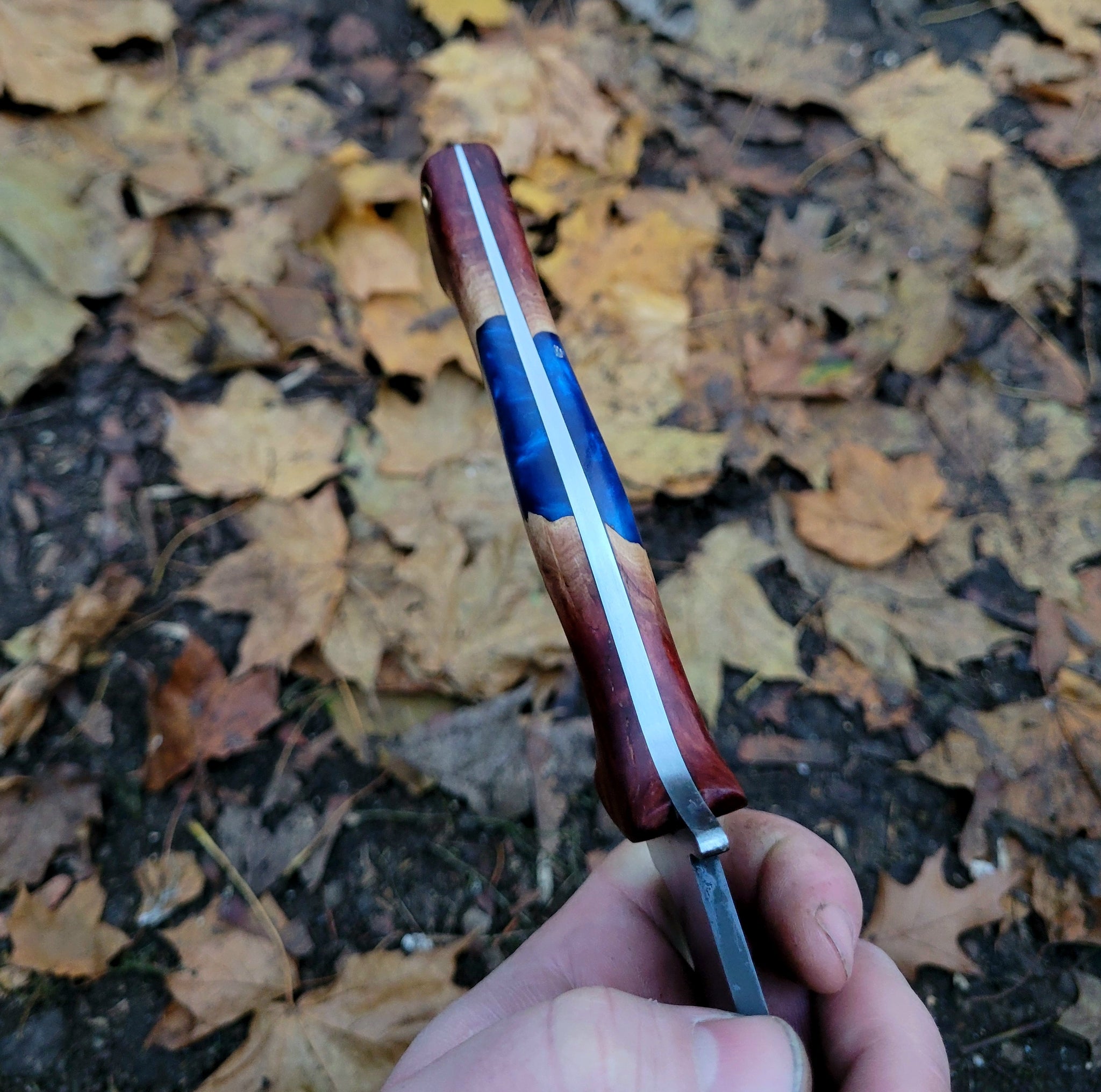 This 1095 Knife is handmade in roughly 3/16" thick 1095 heat treated to 60-61 HRC at the edge with a clay hamon. The handle is stabilized red malle burl with blue resin. Includes dark brown leather sheath.