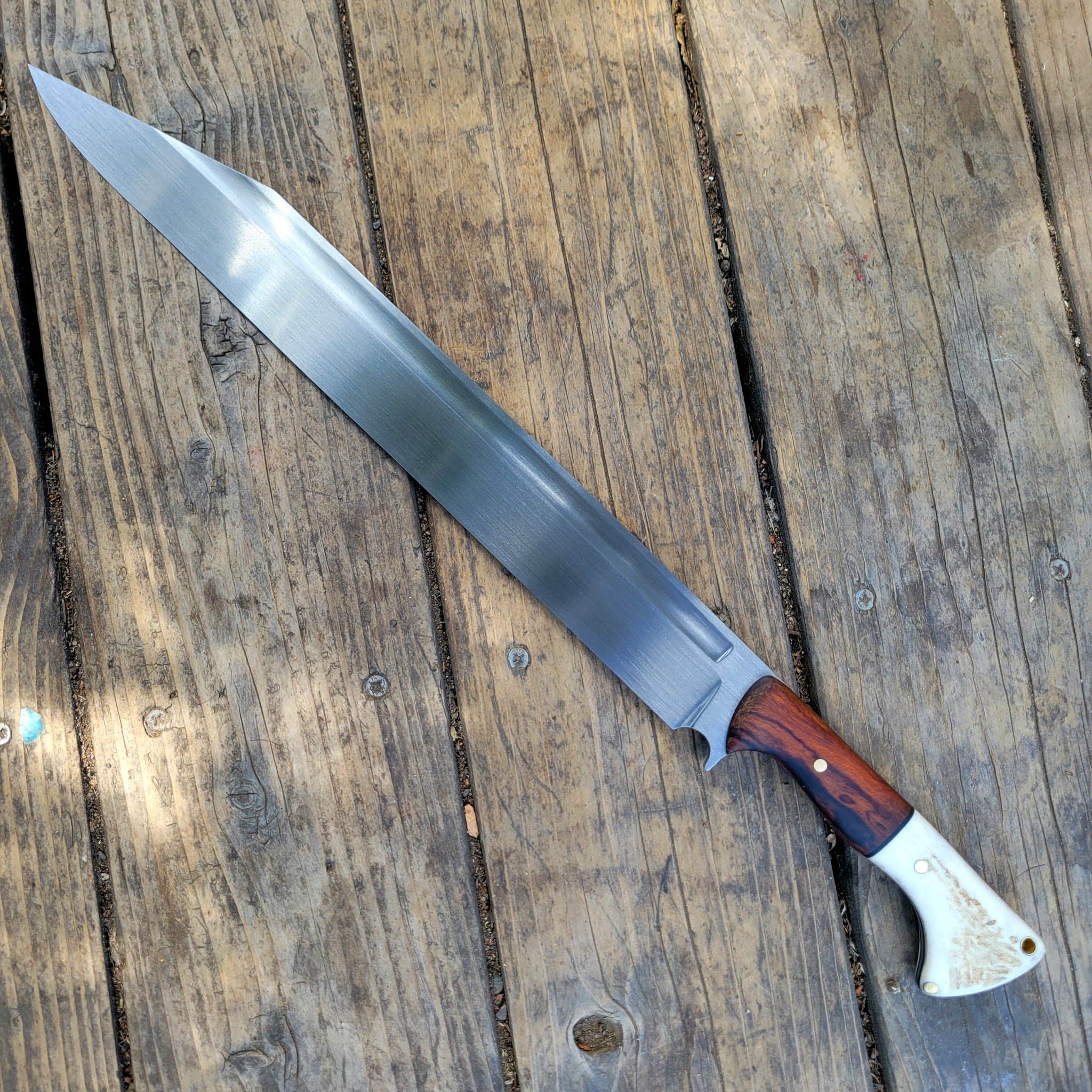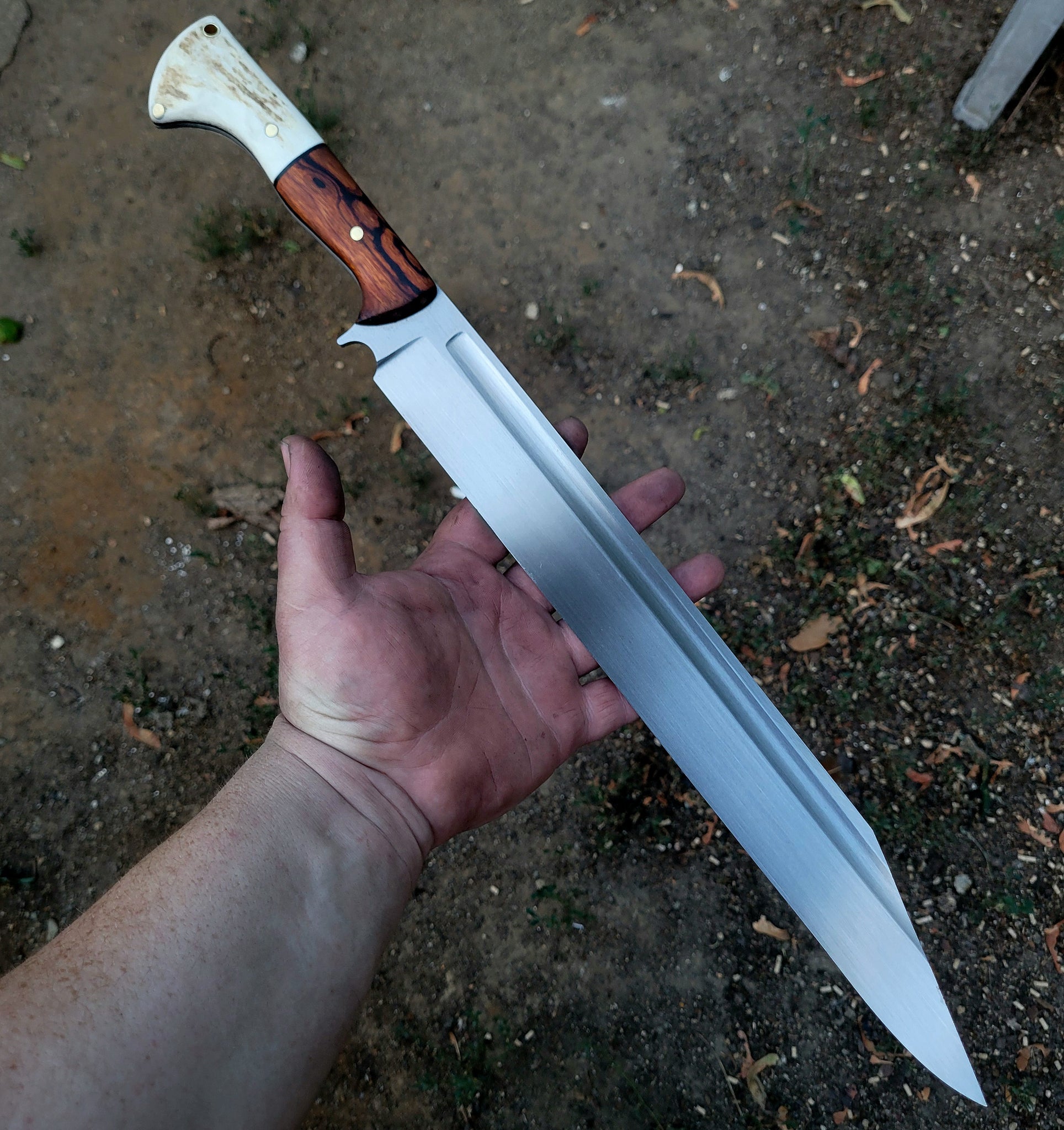 Made in .25" thick 80CRV2 heat treated to 59-60 HRC. Taper tang with desert ironwood and elk antler scales with black g10 liners and spacers.