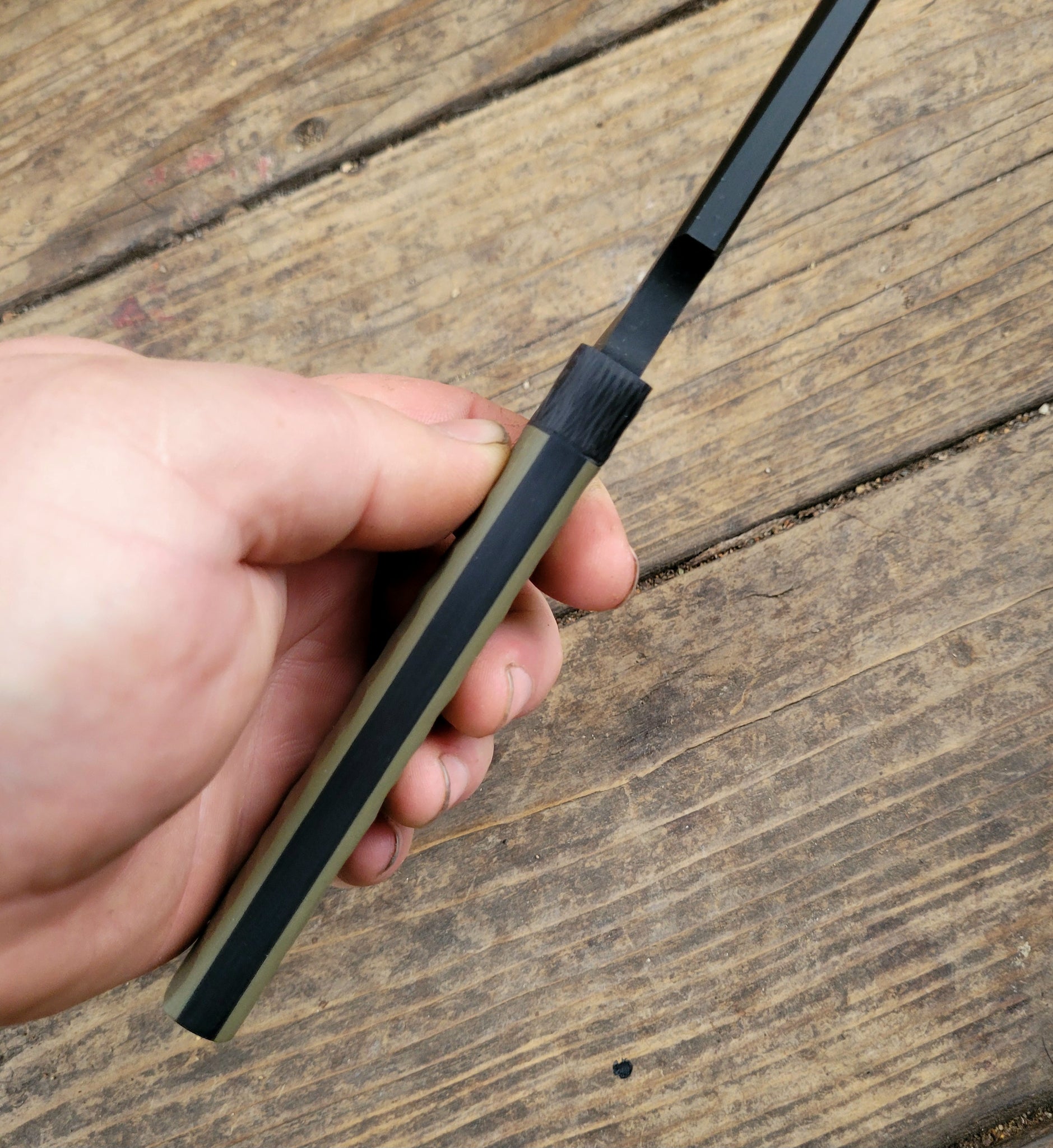 This tactal hidden tang knife is handmade in roughly 1/4" thick CPM Magnacut heat treated to 61-62 HRC. Carbon fiber guard, Armor Black Cerakote blade finish. The G10 handle is secured with torx bolts and Gflex epoxy. Includes black Kydex Sheath.