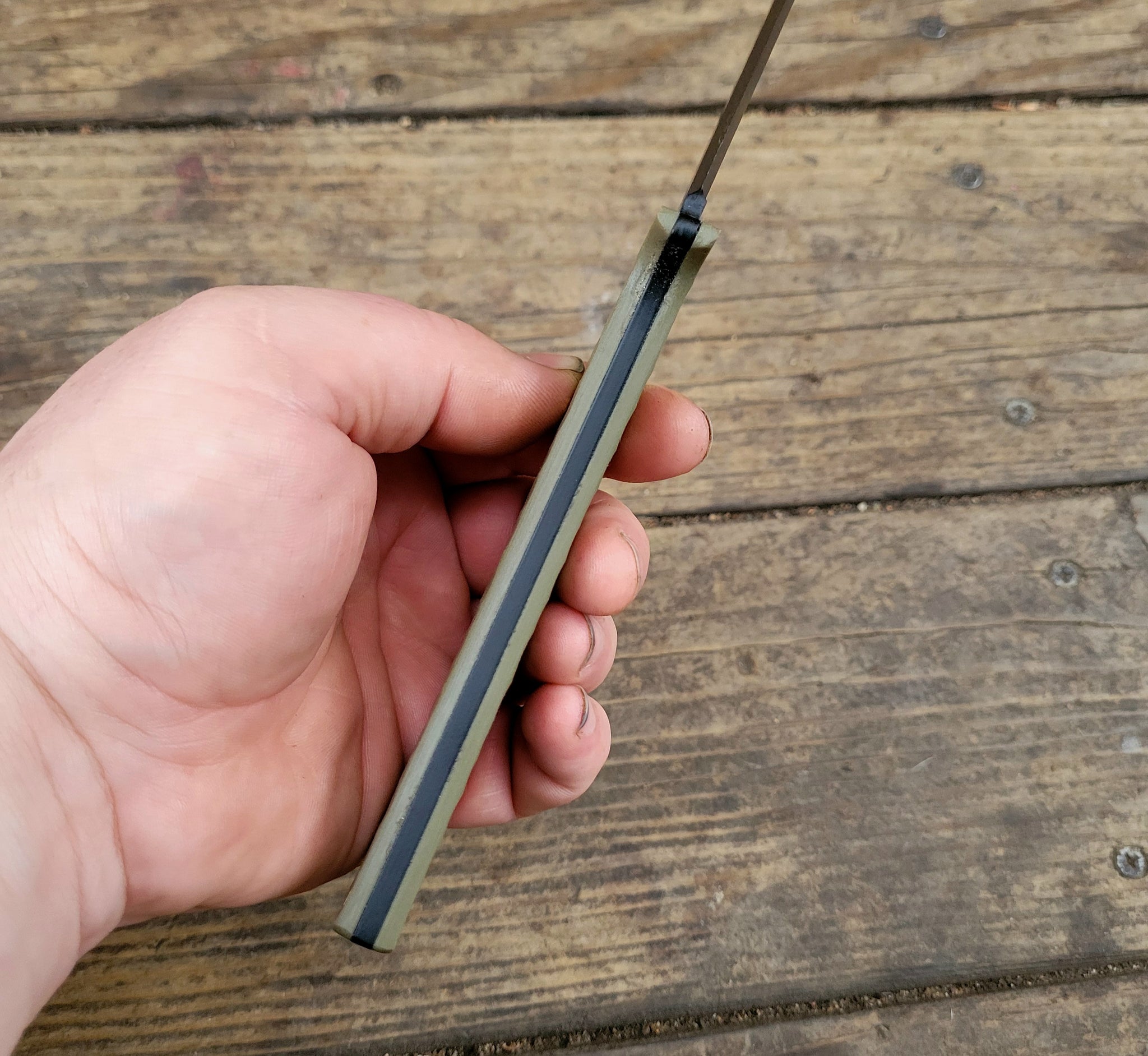 This tactal Tanto knife is handmade in roughly 1/8" thick 52100 heat treated to 61-62 HRC. Armor Black Cerakote blade finish. The G10 handle scales are secured with torx bolts and Gflex epoxy. Includes black Kydex Sheath.