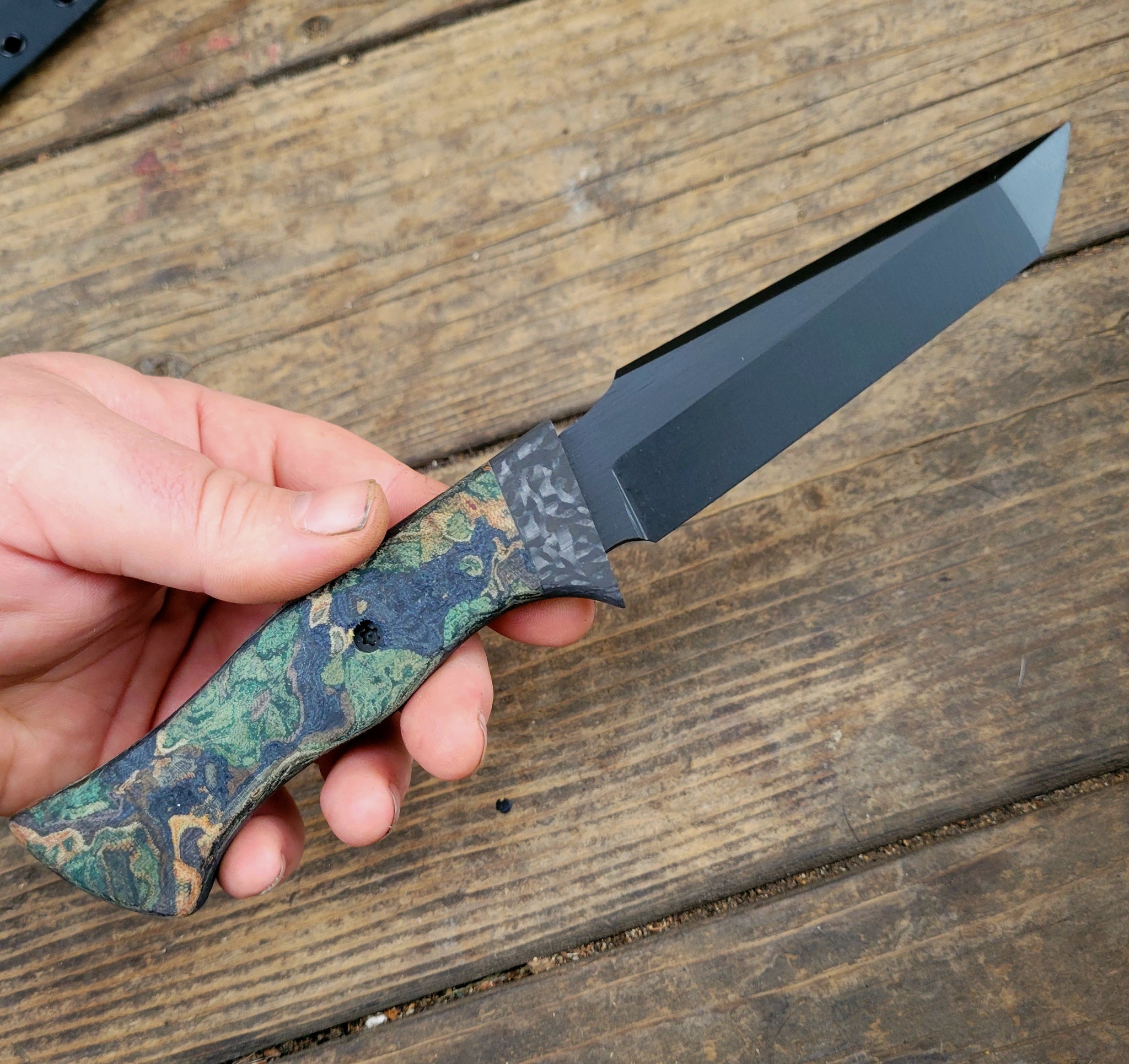 This tactal hidden tang knife is handmade in roughly 3/16" thick CPM3V heat treated to 61-62 HRC. Carbon fiber guard, Armor Black Cerakote blade finish. The G10 handle is secured with torx bolts and Gflex epoxy. Includes black Kydex Sheath.
